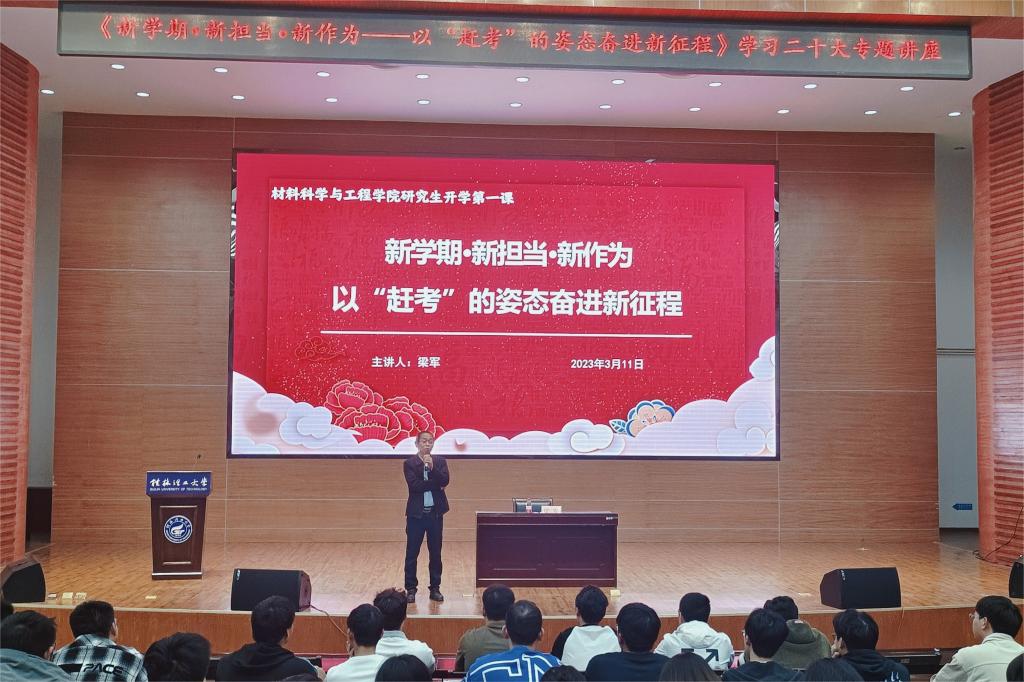 为了深入学习贯彻党的二十大精神,引导学院师生更加深刻领悟“两个确立”的决定性意义,切实在思想上政治上行动上同以习近平同志为核心的党中央保持高度一致。2023年3月11日,学院党委书记梁军同志在屏风校区图书馆报告厅为学院研究生讲授题为《新学期·新担当·新作为——以“赶考”的姿态奋进新征程》学习二十大专题党课。