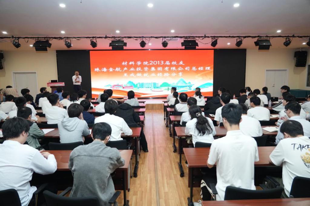高质量人才培养研讨交流会上,雪韩妃(广东)生物医药科技有限公司董事长米志华、广西珀源新材料有限公司董事长陈韬、珠海金航产业投资集团有限公司集团总经理王成等业界精英校友代表,围绕创业与就业经验进行了深度分享,为即将步入社会的材料学子提供宝贵的指导与建议。学院毕业班班主任和100余名本科生积极参与,就职业规划、创新创业等话题进行了深入交流和探讨。
