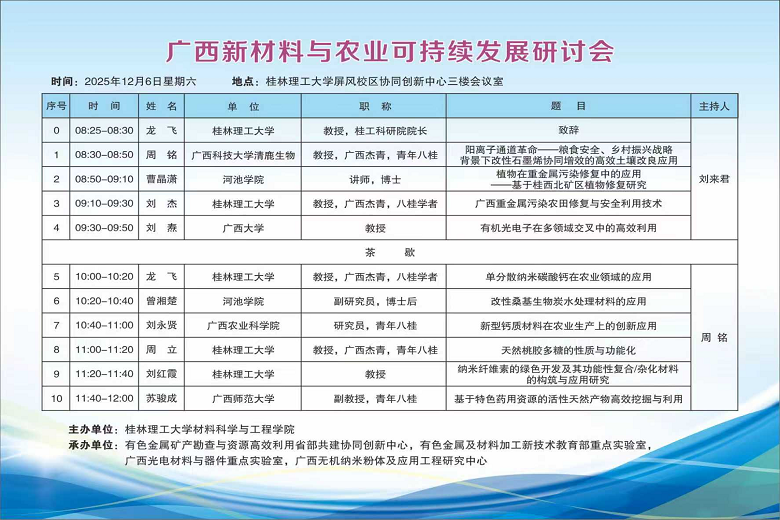 为深入贯彻落实创新驱动发展战略,加强新材料科技在农业领域的创新应用,推动广西乃至全国农业绿色、高效、可持续发展,由yl23411永利集团官网主办、有色金属矿产勘查与资源高效利用省部共建协同创新中心、有色金属及材料加工新技术教育部重点实验室、广西光电材料与器件重点实验室、广西无机纳米粉体及应用工程研究中心承办的2025广西新材料与农业可持续发展研讨会于2025年12月6日在桂林市桂林理工大学屏风校区协同创新中心三楼会议室顺利召开。
