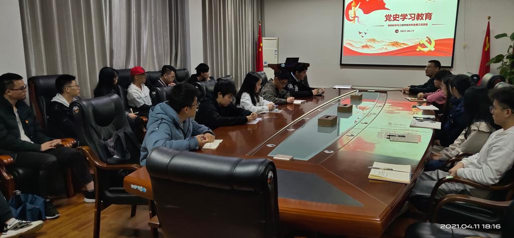 4月11日,材料学院本科生第三党支部在屏风校区2308会议室开展了党史学习教育主题党课,支部全体党员和积极分子参加了主题党课,党课由党支部书记单江涛主讲。