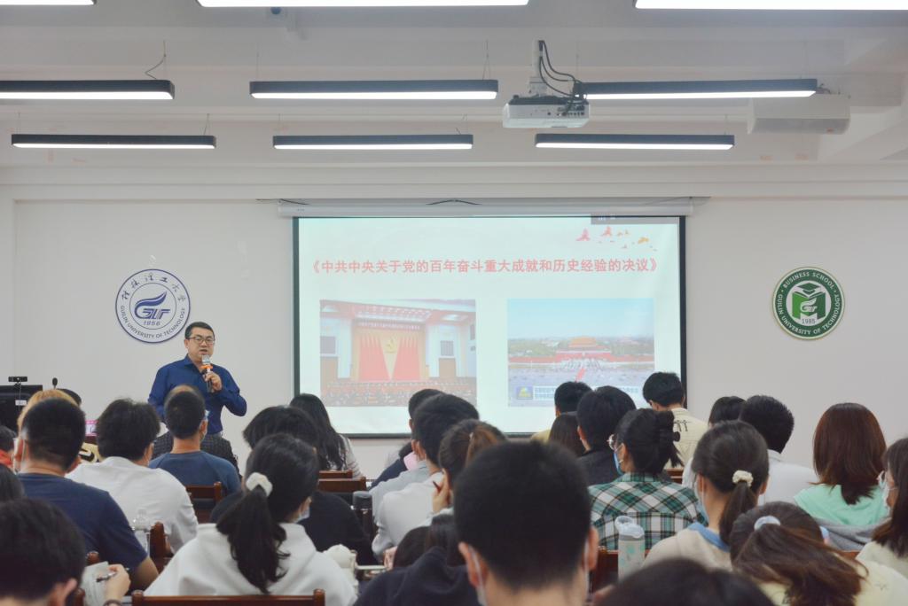 5月24日下午,在屏风校区7309教室,学校商学院党委书记白永生以“深入学习《中共中央关于党的百年奋斗重大成就和历史经验的决议》”为题讲授党课。学院全体党支部支委参加。