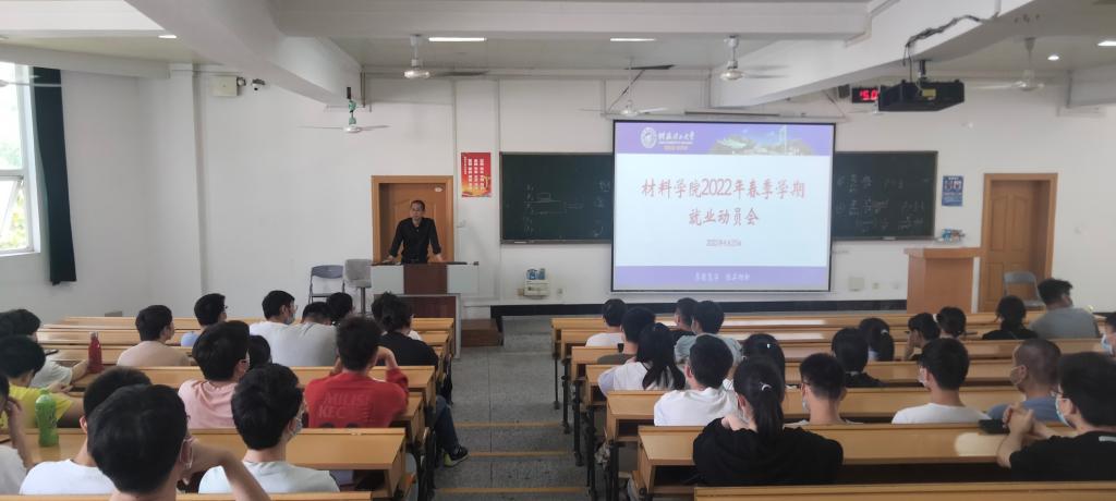 4月25日下午,材料学院在屏风校区9301教室召开2022年春季学期就业动员会,材料学院党委书记梁军作为主讲人出席会议,学院暂末落实就业单位的本科生和研究生100余人参加会议。