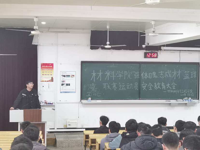 材料学院于3月16日在屏风校区9101教室召开“强体魄、志成材”篮球联赛运动员安全教育大会。学院兼职团委副书记卢桂盛、裁判协会代表以及全体篮球运动员出席本次会议,会议由学院学生会体育部工作人员陈巧富主持。