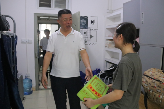 学院领导和老师们来到搬迁现场为同学们加油打气,细致地了解了同学们对新寝室的适应情况,并准备了数箱解暑饮品,亲自送到宿舍,让学生们感到了学院领导老师亲切的关怀和暖心的照顾。