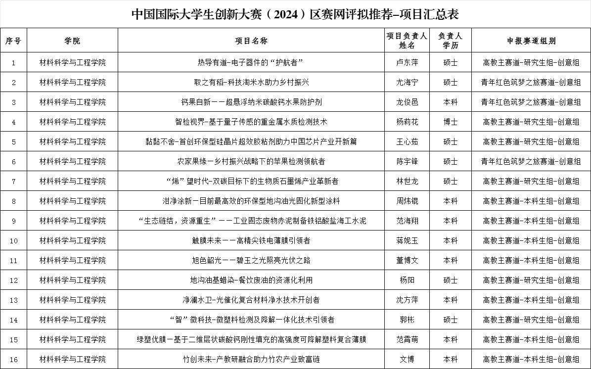 作为学校科研与创新的排头兵,我院始终秉持“创新驱动发展,科技引领未来”的理念,致力于为学生搭建广阔的实践平台,激发他们的创新潜能。此次被推荐的16个项目,不仅是学院师生智慧与汗水的结晶,更是学院科研实力和创新能力的生动体现。这些项目横跨材料科学的多个前沿领域,从新型功能材料的研发到绿色制造技术的应用,从智能材料的探索到环境友好材料的创新,每一项都凝聚着学院师生的心血与期待。