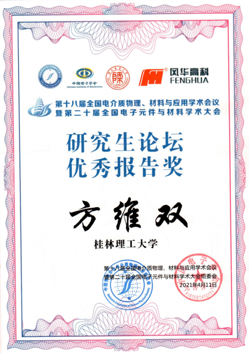 博士生方维双做了题为“系列橄榄石结构CaLnGaO4(Ln = La, Nd, Pr)陶瓷的微波介电性能”的口头报告,并获得了“研究生论坛优秀报告”奖。