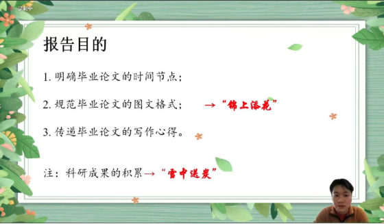 老师主要从明确毕业论文的时间节点”、“规范毕业论文的图文格式”、“传递毕业论文的写作心得三个方面进行讲述。老师引用去年“硕士年终论文送审及答辩的时间节点”作为开头,向同学们明确论文撰写的要点和注意事项。希望同学们端正学习态度,发挥主观能动性,强调“学生是自己学位论文质量的第一责任人”。要求学生对自己论文写作安排做出合理的时间规划,正视培养计划的毕业要求。随后姚老师从学位论文的封面、中英文摘要、目录、绪论、研究内容、结论与展望、参考文献等方面进行逐一讲解。