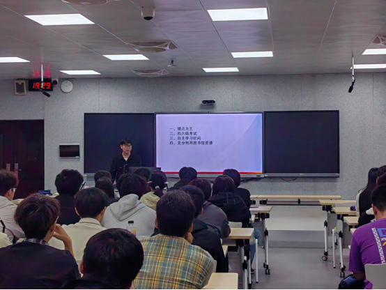 教研室主任黄宏锋老师主持交流会。他对三位高年级同学到场分享学习心得表示欢迎,并强调大学是知识积累与能力培养的关键阶段,希望2025级同学们珍惜学习机会,善于向优秀学长学姐取经,尽早确立发展目标,夯实专业基础。